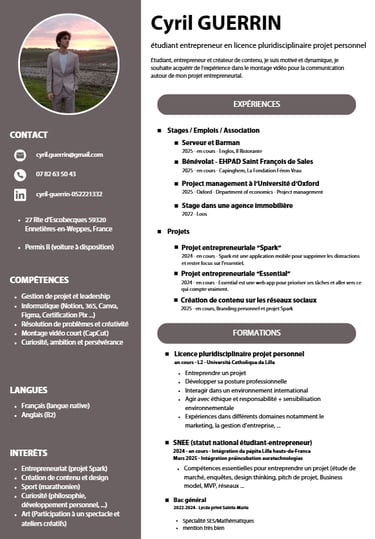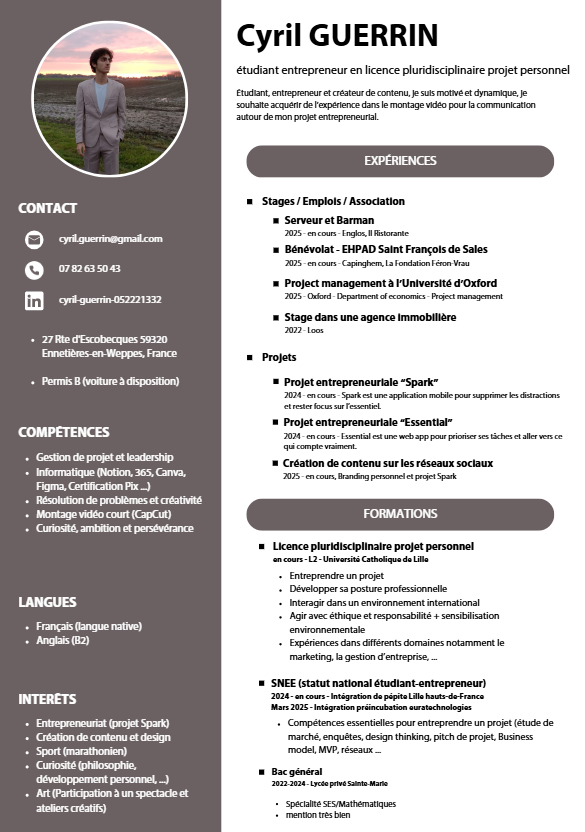 Actuellement en licence pluridisciplinaire projet personnel, je construit mon parcours dans l'entrepreneuriat.
